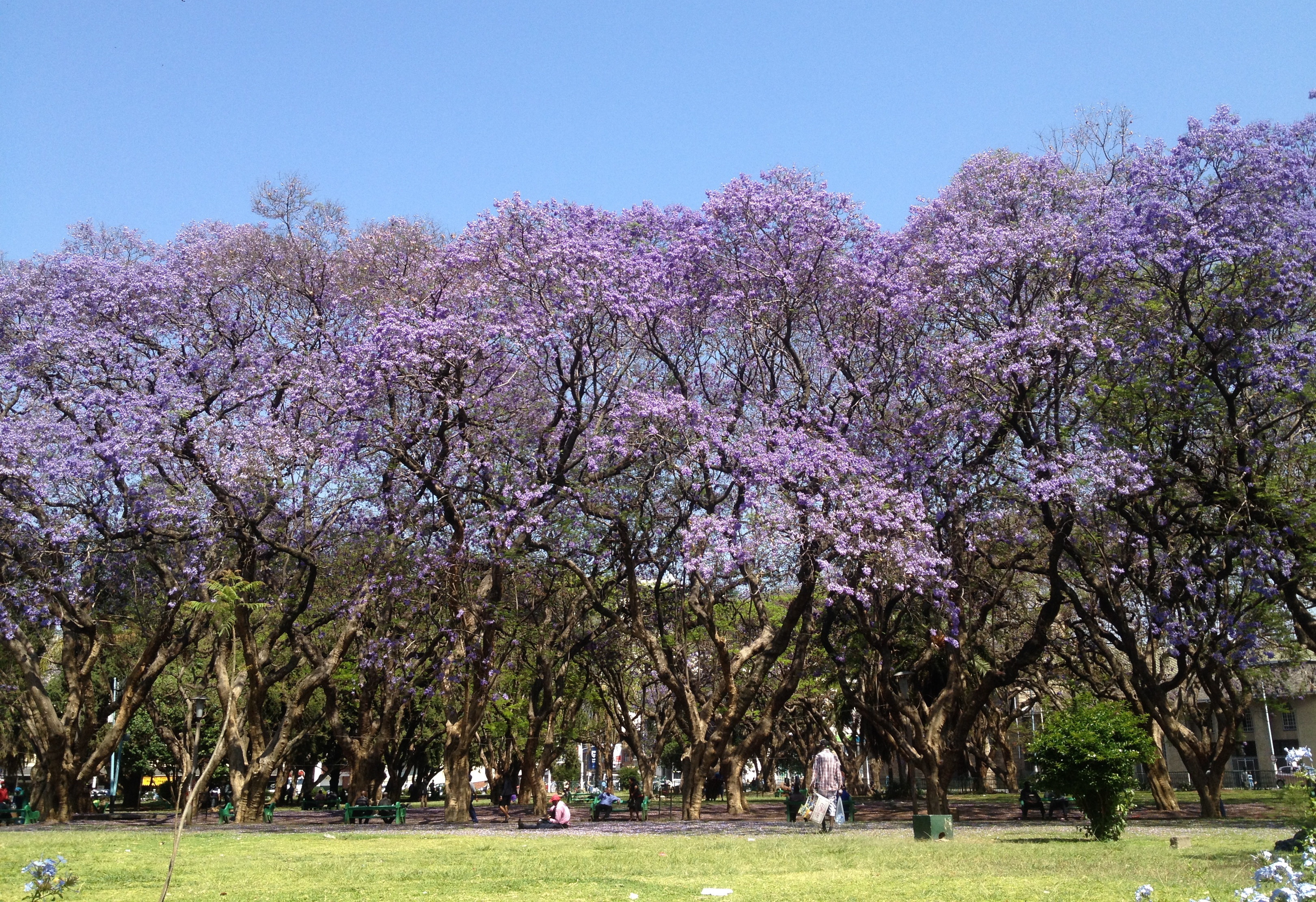 Jacaranda is in fact a “native” of South America, in particular of Brazil. The story goes that the plant was first introduced to Fort Salisbury – the future Harare – in 1899 by a honeymooning couple who carried home six seedlings from the botanical gardens in Durban, South Africa. Thanks to the power of public works projects in the early twentieth century, jacaranda trees soon took root in Salisbury’s parks, gardens and alongside its expanding road network. One of those places was Cecil Square, named for Cecil Rhodes, whose British South African Company took control of this part of central Africa in the 1890s and laid out in the form of a Union Jack flag. Following the end of white-minority rule and the transformation of Rhodesia to Zimbabwe, many of the colonial place names were changed, with Cecil Square taking the name Africa Unity Square.